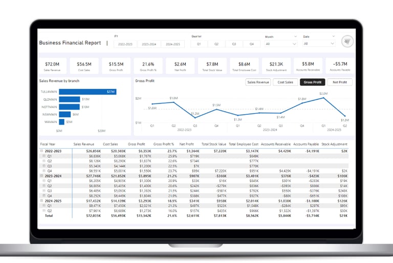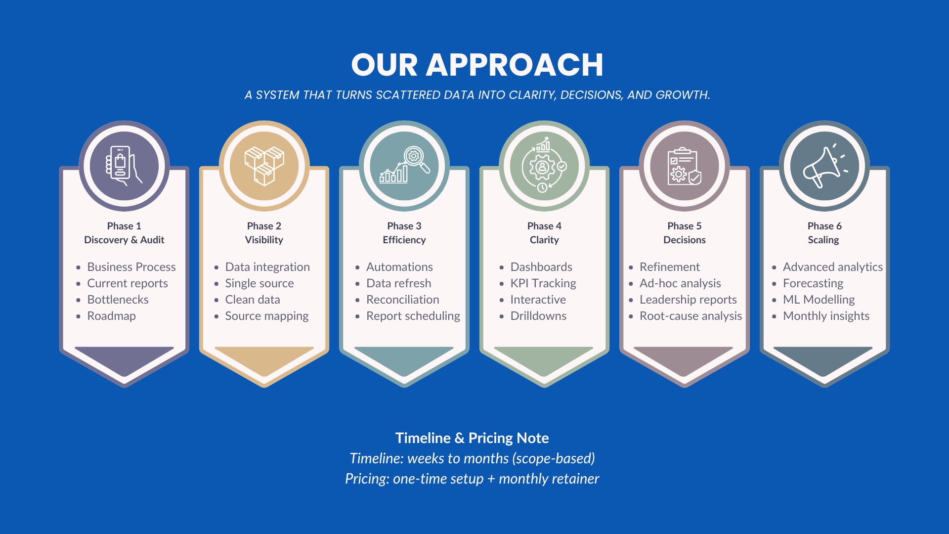 We deliver a full-stack, done-for-you BI system from raw data to decision-ready dashboards customized to your business. Unlike one-off dashboards or generalist analysts, we build scalable systems that evolve with your needs, including data integration, automation, and strategic insights.